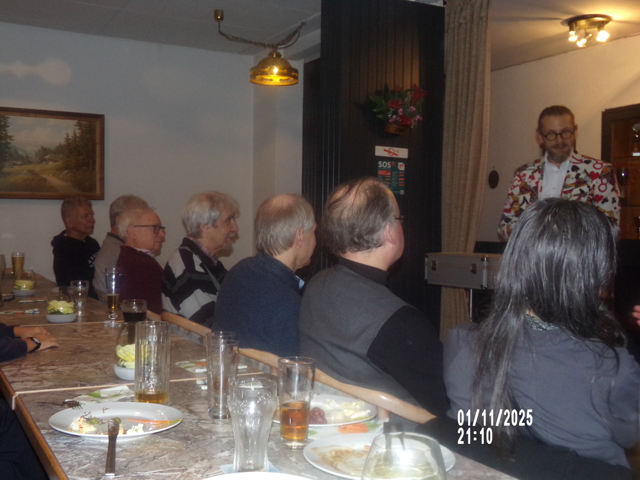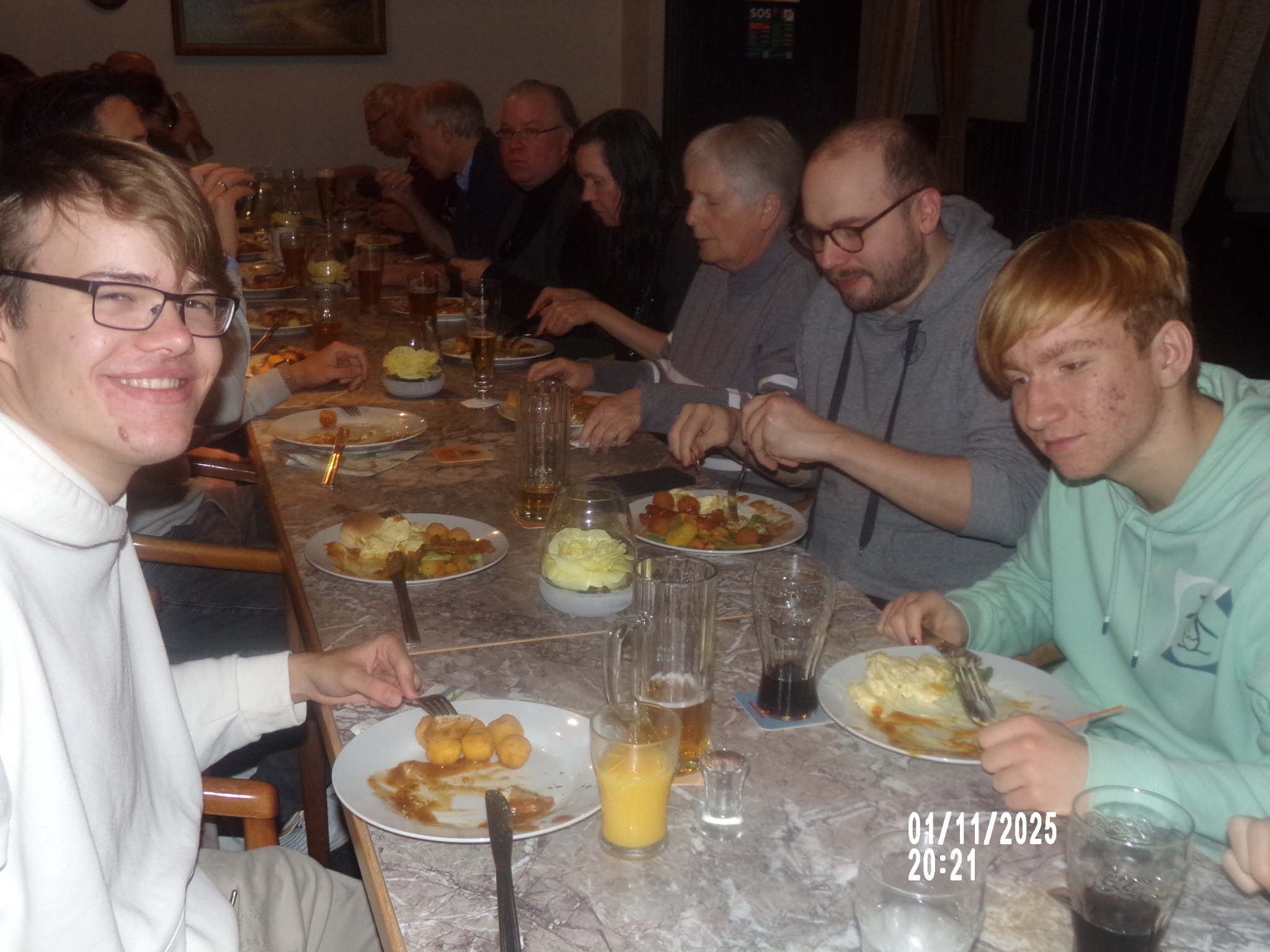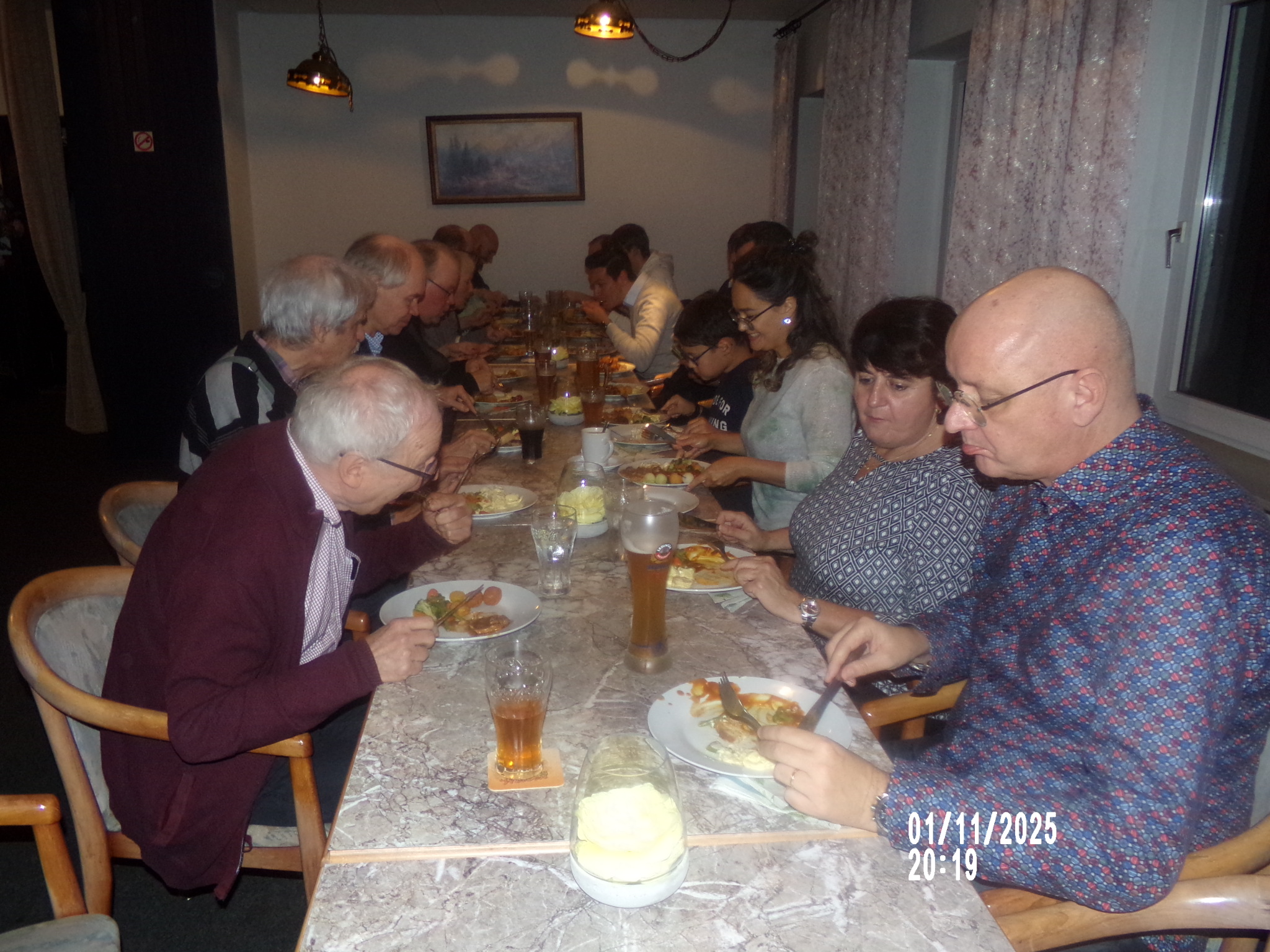 Nach Ende des zweiten Kurzseminars waren auch alle Abendgäste eingetroffen, so dass die Feierlichkeit in den Speiseraum verlagert werden konnte. Dort fand Jürgen Carsten kurz vor 19 Uhr lobende Worte zum Gastronomiebetrieb "Rote Wiese", insbesondere zum Gastronomiebetreiber Peter Buchhorn sowie zu seiner Mitarbeiterin und Lebensgefährtin Anna, bevor dann um 19 Uhr das Abendbuffet eröffnet und leckerste Speisen angeboten worden sind: Mini-Currywürste in pikanter Sauce, Schweinerücken in Champignonsauce mit Kaisergemüse und Kroketten sowie Tortellinis in Käsesauce, Katenschinken mit Honigmelone, Pfefferfrikadellen, Brötchenkonfekt und einiges mehr. Auf den beiden Fotos ganz oben sieht man auch, dass es allen lecker schmeckt, wobei auch die Menge und Auswahl der zur Verfügung stehenden Getränke üppig war.