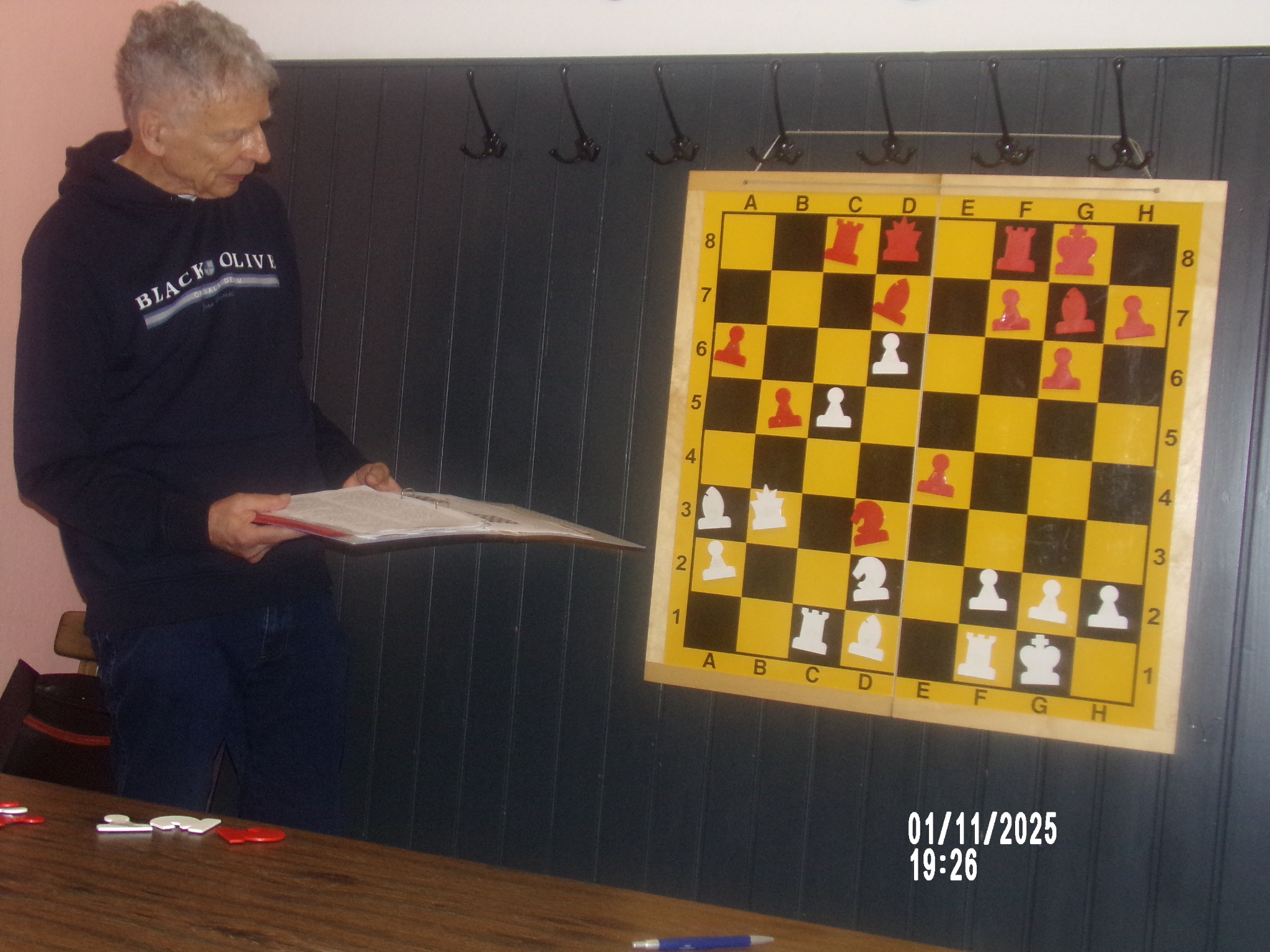 Von ca. 17:05 bis etwa 18:35 Uhr hielt FM Prof. Dr. Christian Clemens das Kurzseminar "Jahrhundertbegegnungen mit den Großmeistern und Schach-Weltmeistern Bobby Fischer (+ 2008) und Boris Spasski (+ 2025) nebst Partiebeispiel(en)". Zunächst ging Christian Clemens auf die sich stark voneinander unterscheidenden Persönlichkeiten und Charaktere der beiden vorgenannten Weltmeister unter Bezugnahme auf seine Tätigkeit als Professor für Psychologie und seine praktische Tätigkeit als Psychologe ein, bevor er schließlich seine Partie gegen Bobby Fischer am Demobrett zeigte und hierbei verschiedene Partievarianten erklärt hat.